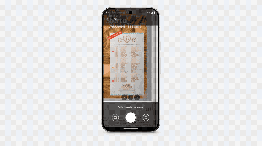 用户可以长按电源按钮或说“Hey Google”召唤Gemini,使其在任何地方随时提供帮助,例如在所用应用的顶部调出Gemini的叠加层,询问有关屏幕上内容的问题。