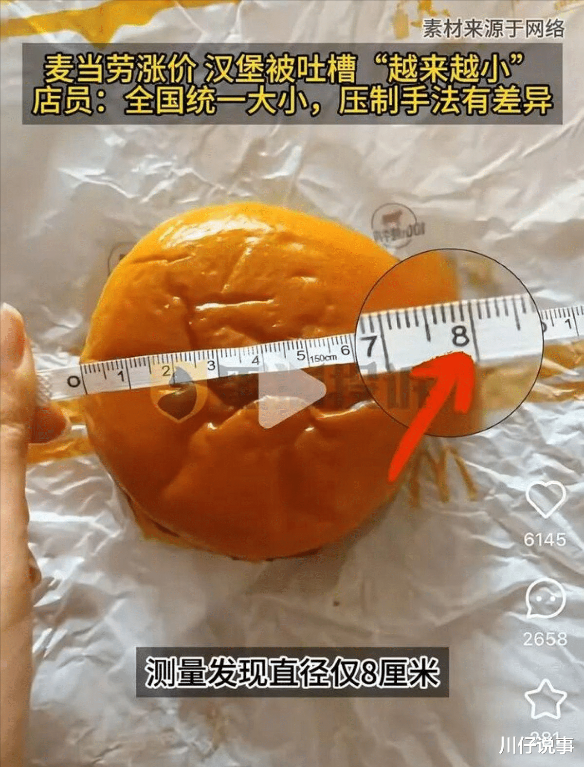在微博,#麦当劳汉堡尺寸缩水#的话题阅读量持续上升;在小红书,网友晒出的“双层吉士堡vs耳机盒”对比图被转发数万次;在抖音,博主用卷尺测量的“8厘米直径汉堡”视频,评论区全是“我就说最近吃着没饱感”的共鸣。
