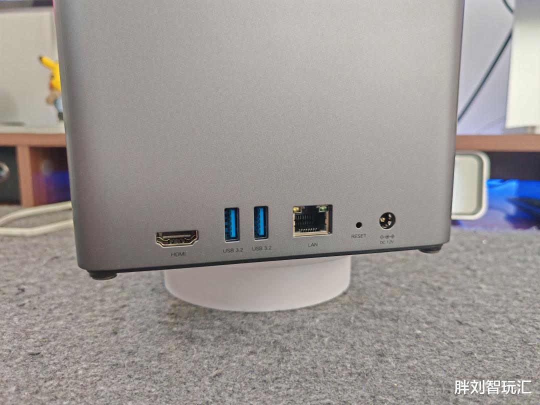 绿联DH4300 Plus拥有很丰富的接口区域:一个HDMI 2.1接口、两个USB 3.2 A口、一个2.5G BE网口、一个电源接口和一个重置接口。