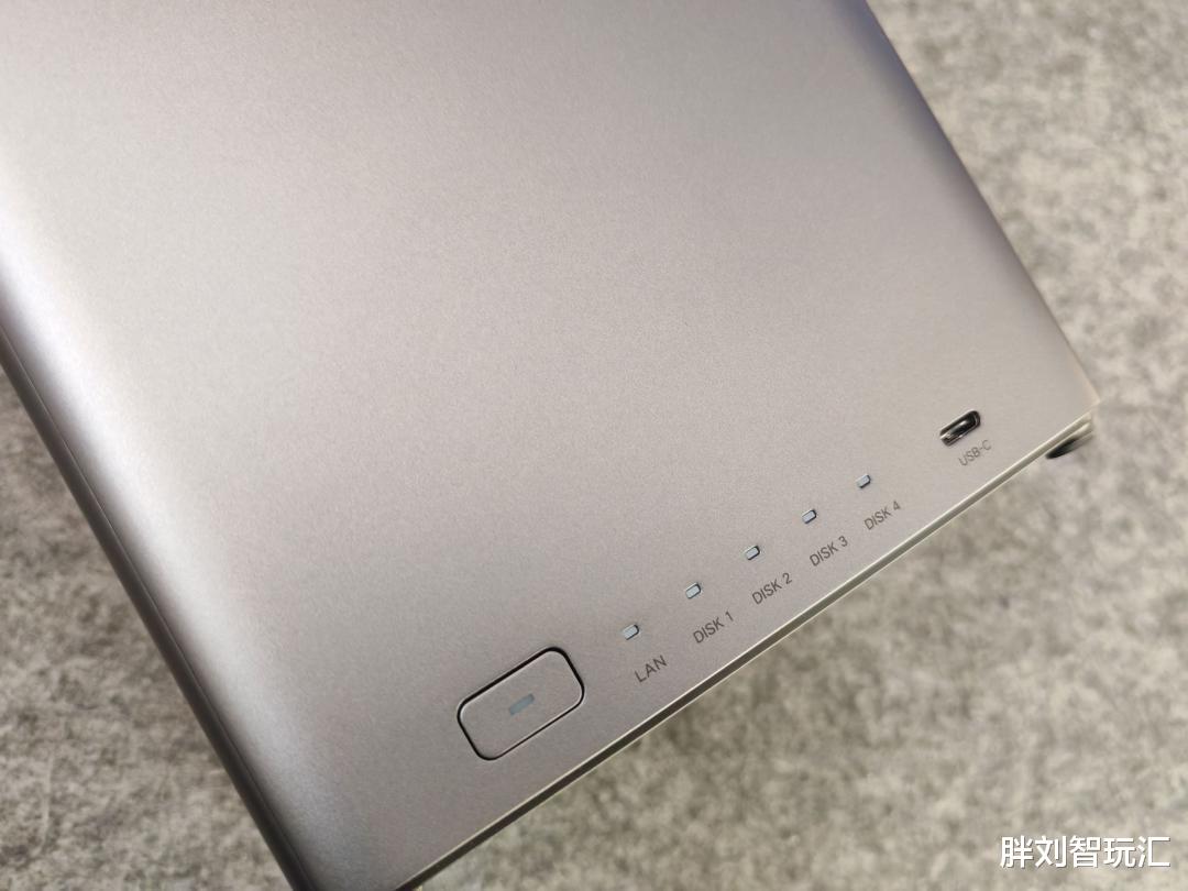 机身正面下方依次排列着电源键、网络指示灯和四个硬盘指示灯,灯光柔和不刺眼,即使夜间放在卧室也不会造成干扰,还能通过指示灯直观了解设备运行状态。并且配备了一个USB 3.2 C口,方便临时连接U盘、移动硬盘传输数据