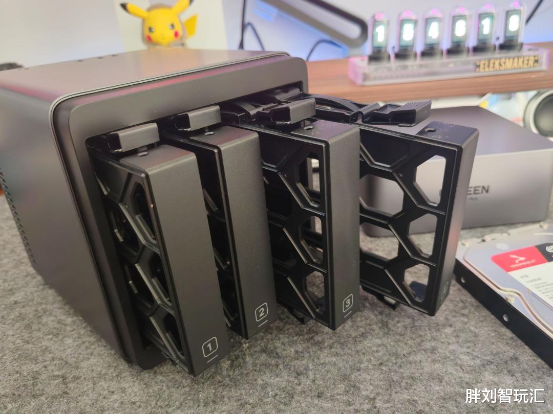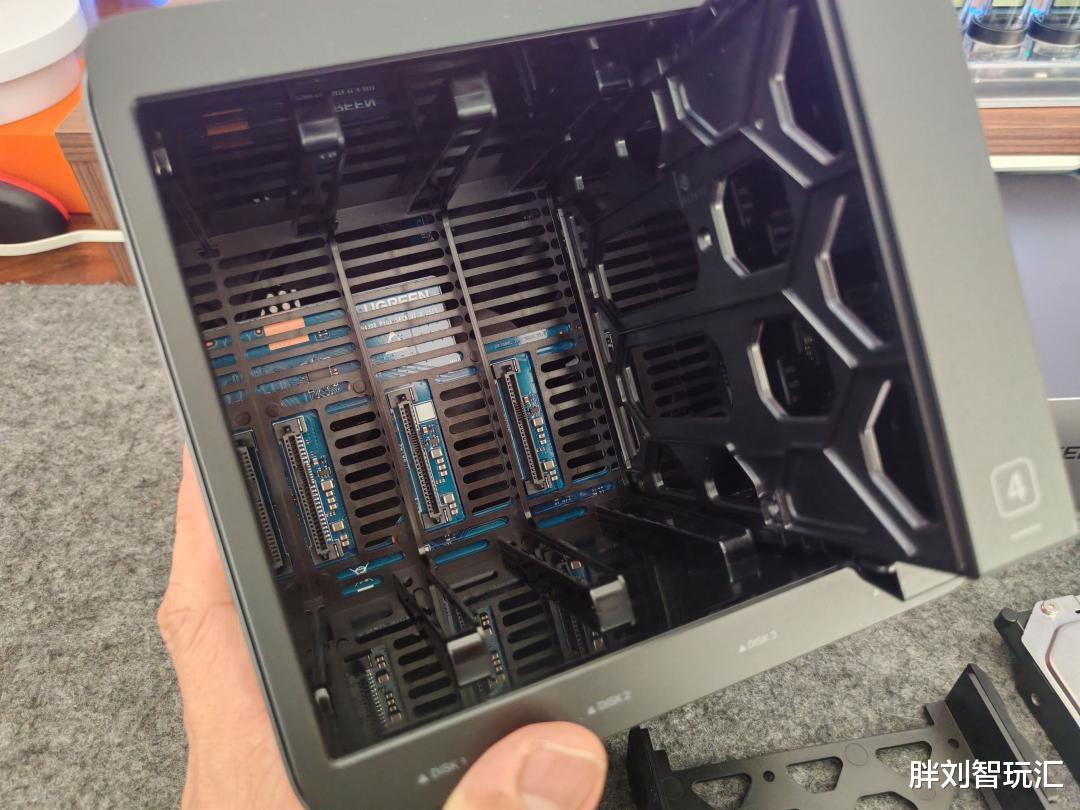 打开磁吸顶盖后,就能看到四个竖向排列的硬盘仓位,即最大可支持4块3.5英寸或2.5英寸硬盘,总存储容量最高可达120TB。