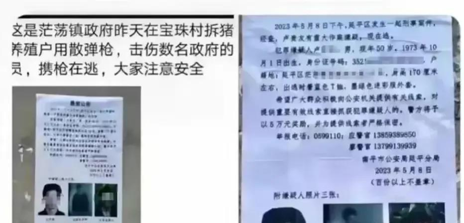 福建省南平市廷平区茫荡镇发生一起枪 击 事 件,农管在没有事先通知,沟通,协调的情况下,拆除养猪户东拼西凑40万,在荒废20年的山上建的猪舍,没想到养猪户卢某友拿出改造的射钉枪,对着农管、民警、有关人员就是一顿火力输出,造成农管人员三人受伤,卢某真是打响了反对农管的第一枪!