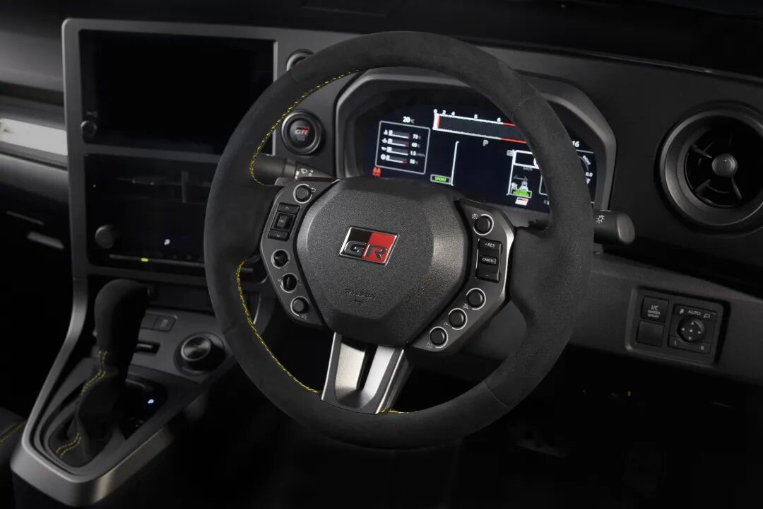 最令人兴奋的升级或许在座舱内,GR雅力士 Morizo RR配备了全新设计的专属方向盘,采用赛车运动风格设计。方向盘以Alcantara材质包覆并点缀黄色缝线,同时集成了音响与巡航控制功能的定制按键,仪表盘也采用了定制化的显示界面。
