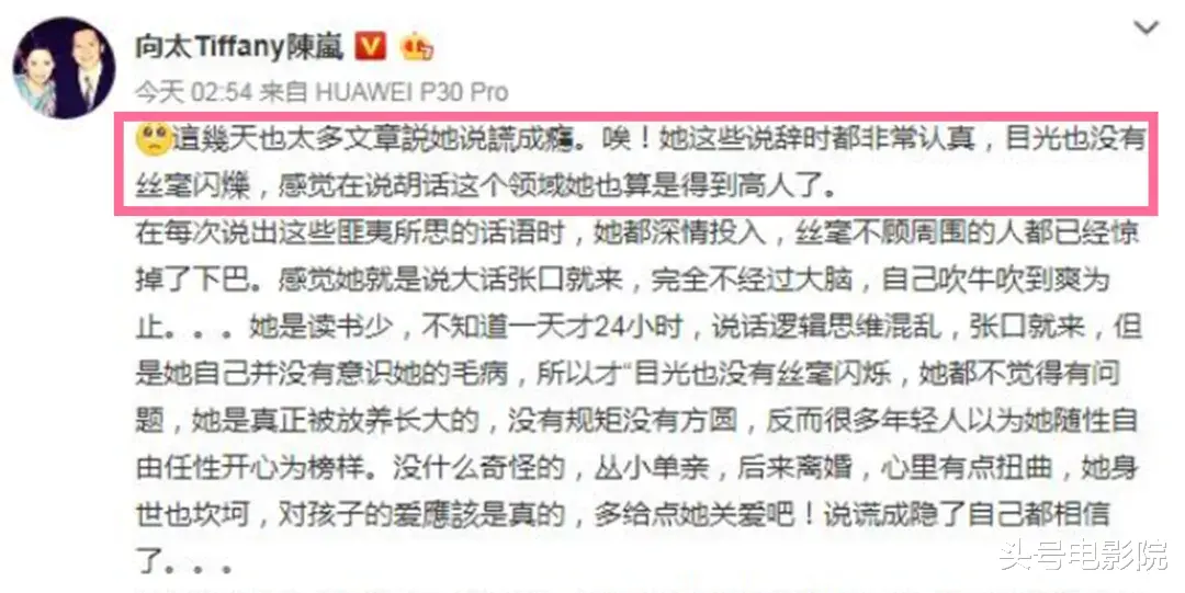 当时,向太发长文diss张柏芝,称“在说胡话这个领域她也算是得道高人”,评价其读书少,说话逻辑混乱,导致很多谎话张口就来,说谎成瘾自己都信了。