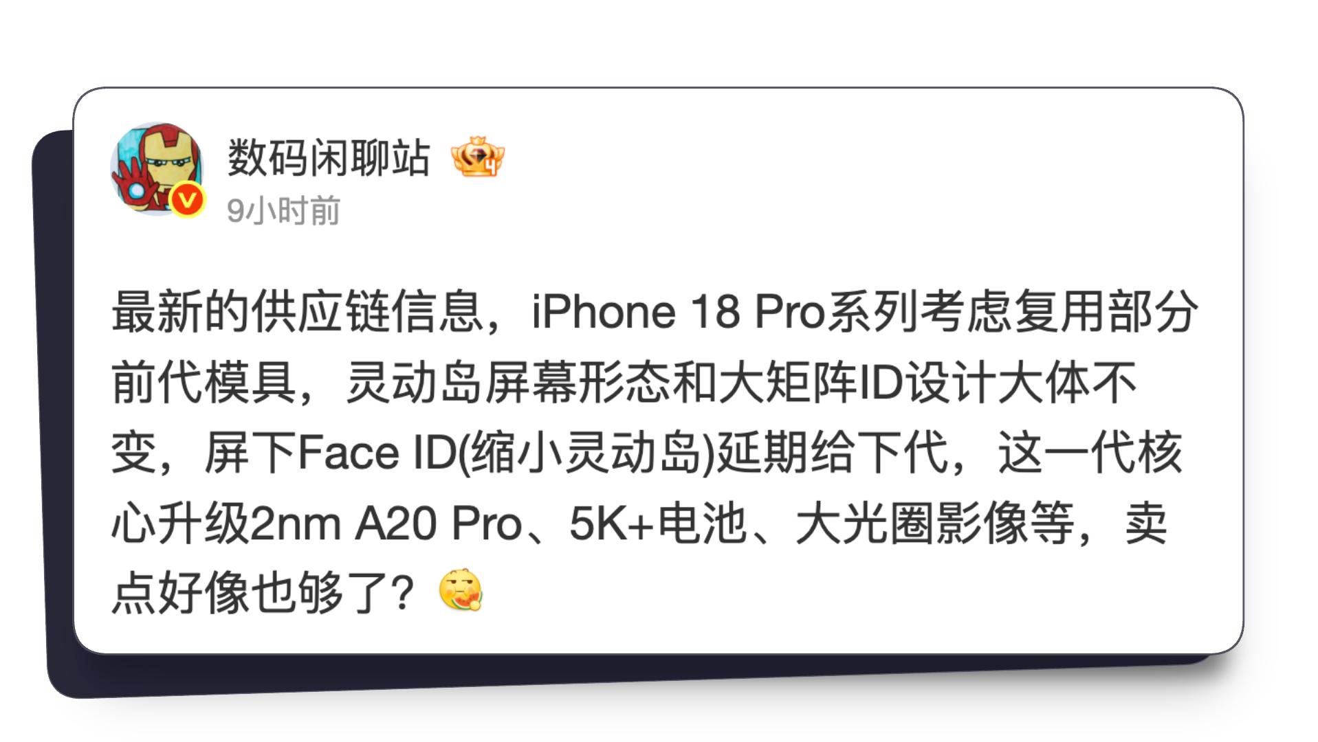 知名博主数码闲聊站分享了一则供应链信息称,iPhone 18 Pro 系列苹果正在考虑复用部分前代模具,整体外观变化不会太大。灵动岛的屏幕形态以及背面的“大矩阵”设计基本保持不变,而屏下 Face ID 技术则延期到下一代产品。