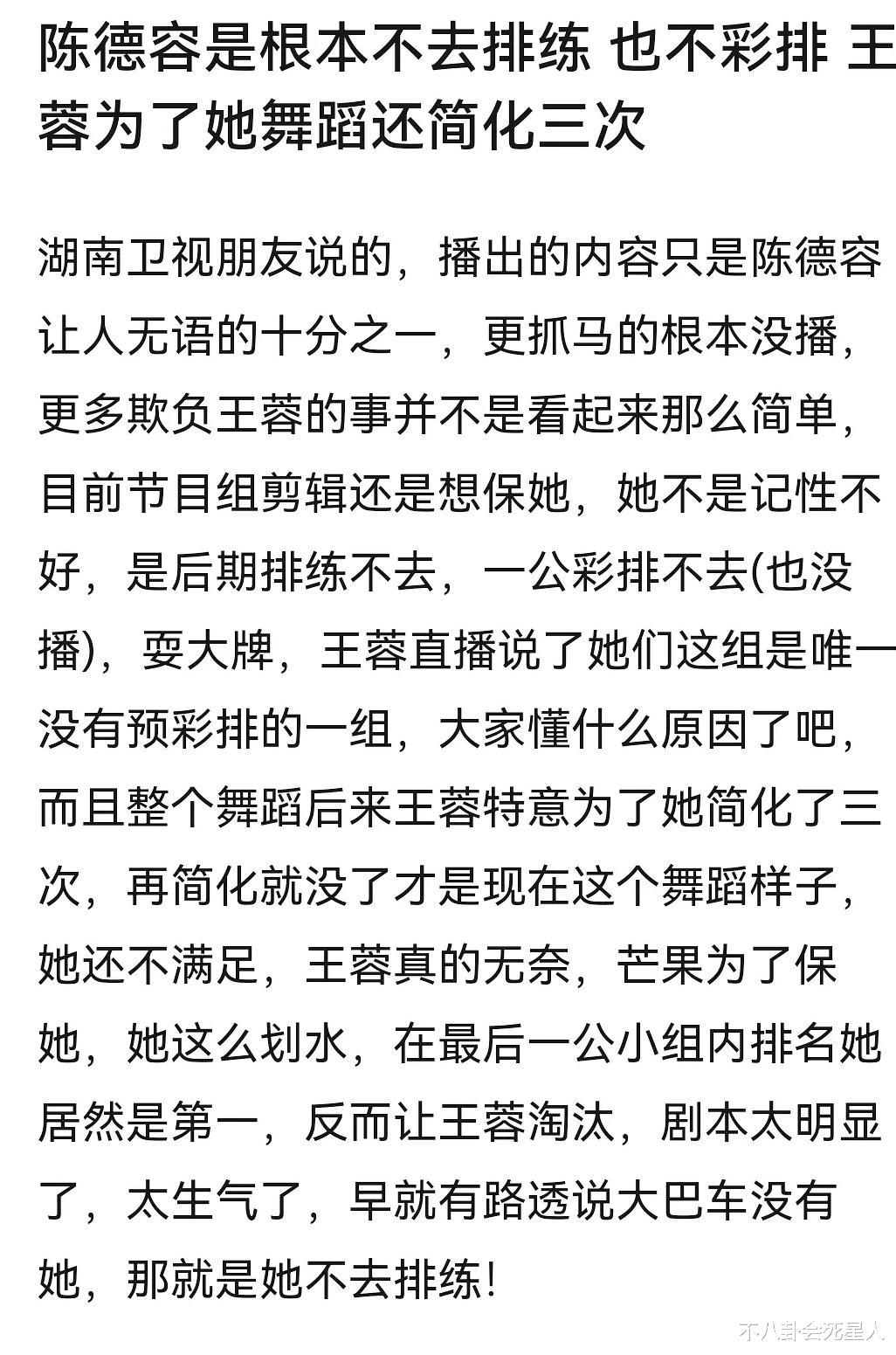 甚至,陈德容连一公彩排也没有去,王蓉说自己这一组是唯一没有预彩排的一组,也与这位知情人的爆料相吻合。