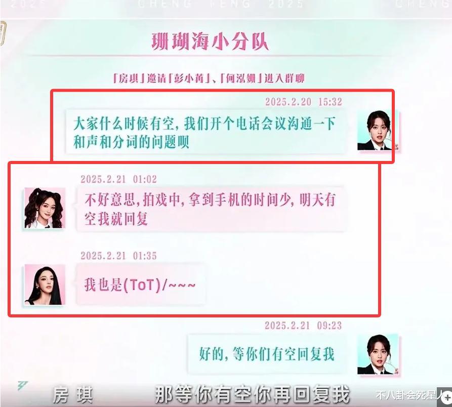 房琪在第一次跟音乐老师见面时,就“告状”彭小苒和何泓姗对自己要求协商歌曲的事情,置之不理。她将三人的私信曝光了出来。