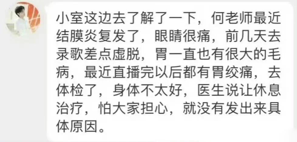 根据工作室的声明,停播的原因是何秋亊近期结膜炎复发,同时伴有胃绞痛,体检结果显示身体状况不佳,医生建议她休息并接受治疗。