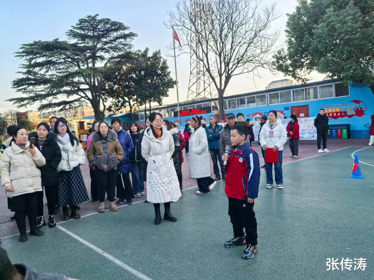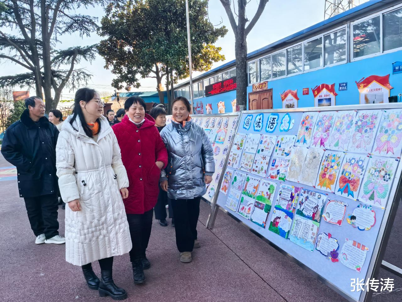户外区域同样精彩纷呈,“趣味语文”手抄报、“数学嘉年华”实践作品展板前,家长们认真欣赏孩子的学习成果,用手机记录下珍贵瞬间;户外集会环节,学生代表自信分享社团活动收获,跳绳等文体展示更是赢得家长们的阵阵掌声,生动展现了孩子们在校园里的活力与成长。