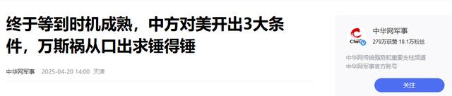 终于等到时机成熟,中方对美开出3大条件,万斯祸从口出求锤得锤——中华网军事2025-04-20