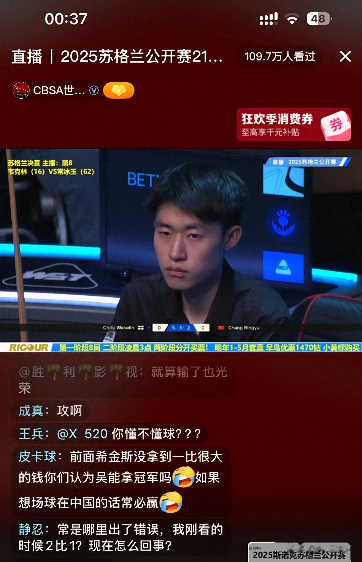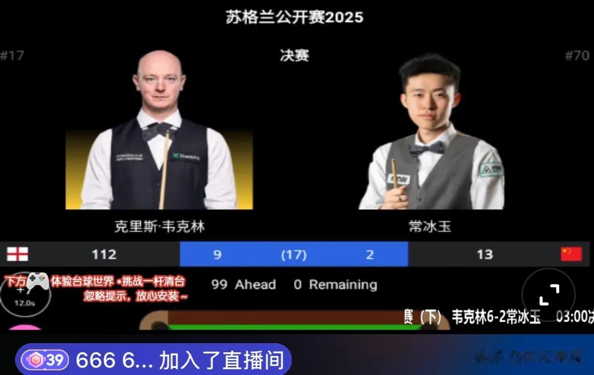 2025斯诺克苏格兰公开赛决赛太刺激了!12月21日晚开始这场对决,是中国小将常冰玉和英格兰名将韦克林的较量。常冰玉今年重返职业赛场,状态超火,连续战胜4位前十六选手才进决赛。上半场一开始,常冰玉有点紧张,首局两次拼球不进,让韦克林103分清台拿下。不过他迅速调整,第二局扳回,第三局更是轰出单杆破百107分,2-1反超。之后韦克林也厉害,扳平比分。下半场韦克林连赢四局6-2领先,常冰玉有点懵了。但比赛还长,期待常冰玉后面能逆袭!