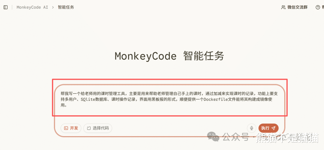 为了让大家都能亲手构建并部署项目到 NAS,熊猫调研了大量支持云端环境的 AI 工具,最终锁定了一个国产开源项目——MonkeyCode。它更像是一个云端IDE(集成开发环境)。官方目前开放了20000点的测试算力,对于尝鲜和中小型项目开发来说,绰绰有余。GitHub地址:https://github.com/chaitin/MonkeyCode