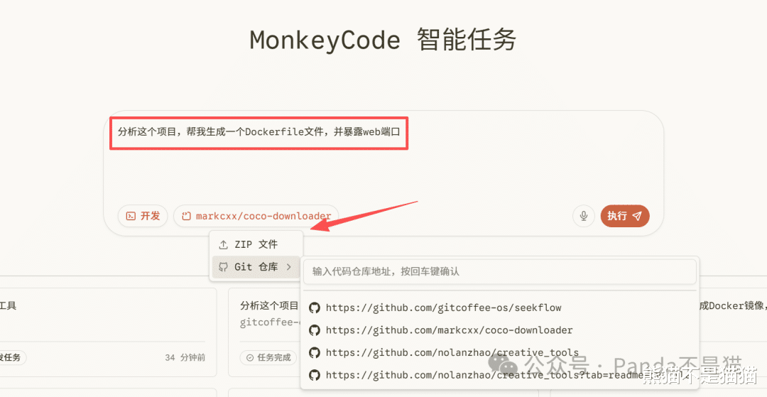 利用MonkeyCode,我们可以上传代码压缩包或绑定Git仓库,让AI分析代码结构,自动生成并调试Dockerfile文件。