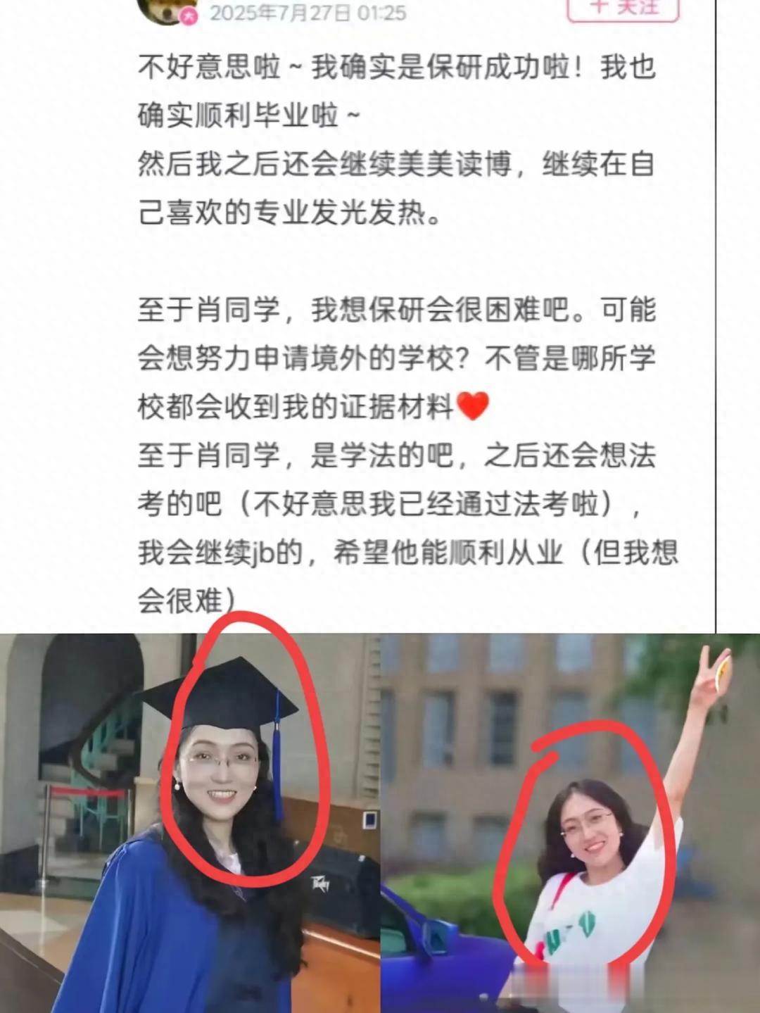 “我保研成功了,美美读博,我法考通过了。我还会继续举报肖同学。”