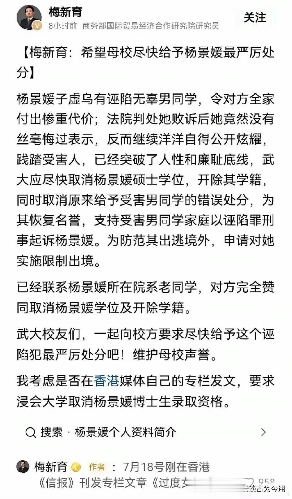 武汉大学校友、商务部研究员梅新育的呼吁振聋发聩:“武汉大学尽快取消杨景媛硕士学位,开除其学籍,同时取消给肖同学的错误处分...支持肖同学以诬陷罪刑事起诉杨景媛。”