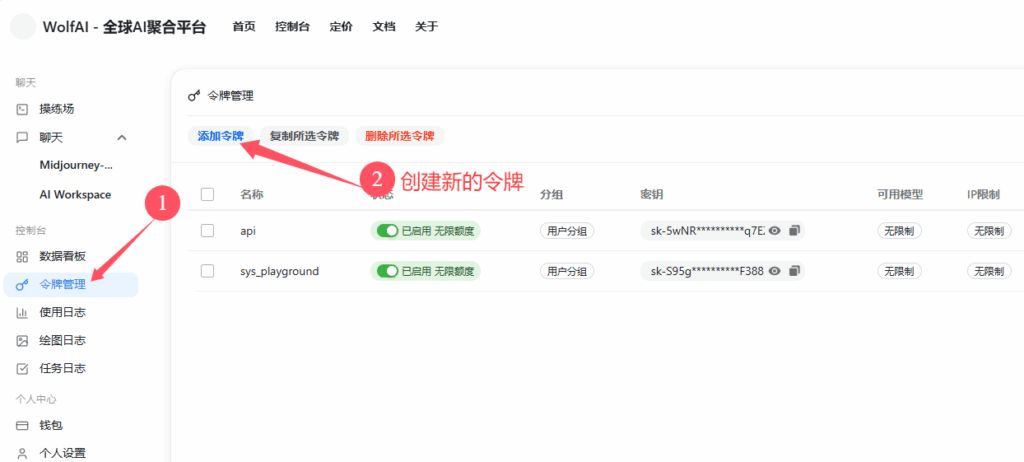 注册并登录中转API平台(https://wolfai.top) 控制左侧台找到“令牌管理” 添加令牌,额度设为无限额度,有效期选永不过期