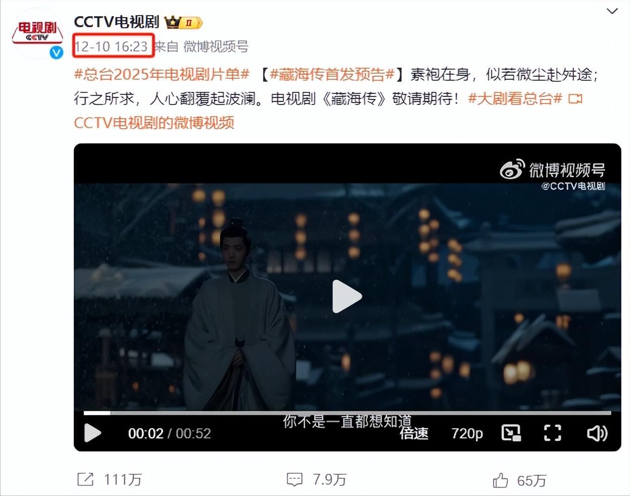 再者,央视发《藏海传》的时候,还特意卡点1623这个数字,在10日下午16点23分发了这部剧。