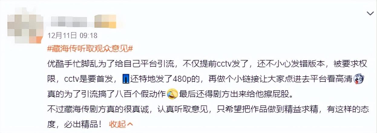 据悉,有网友分析,是裤厂想要给自己的平台引流,所以在手忙脚乱的情况下,提前CCTV一步发布了该剧的预告片。