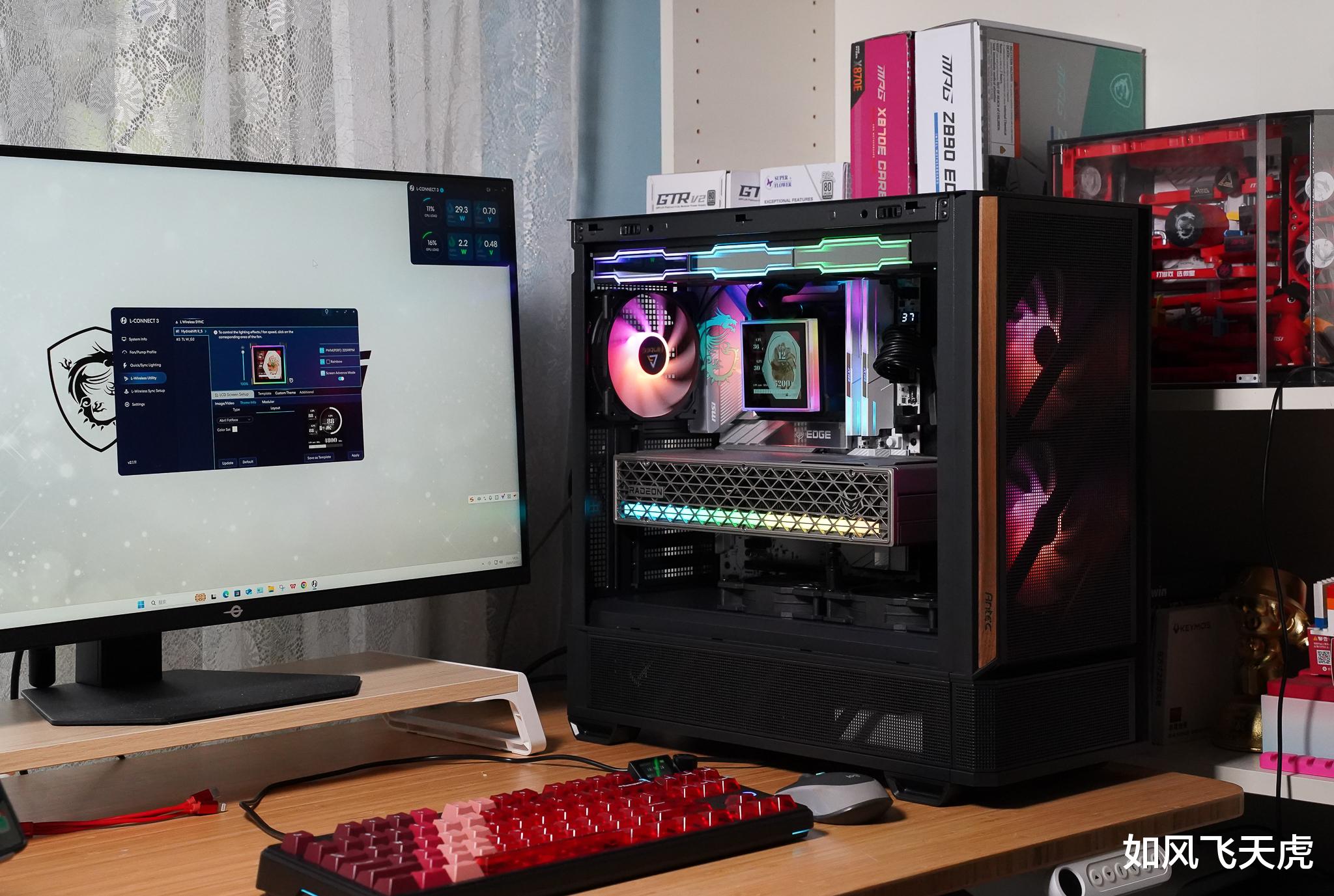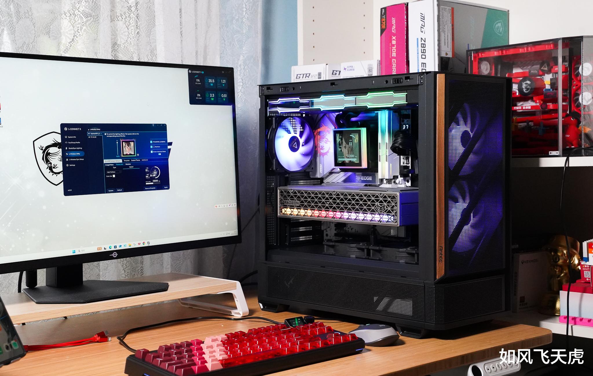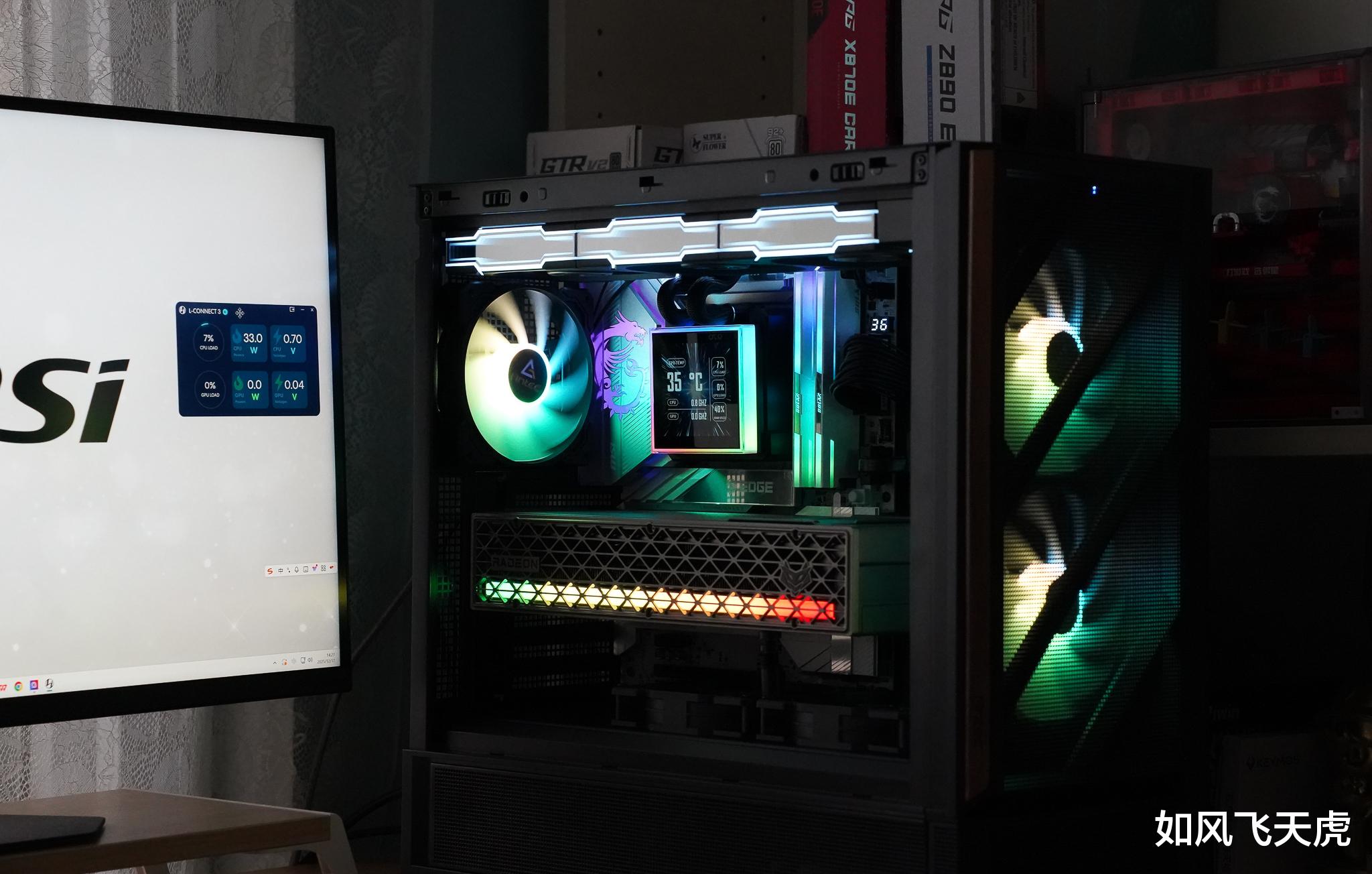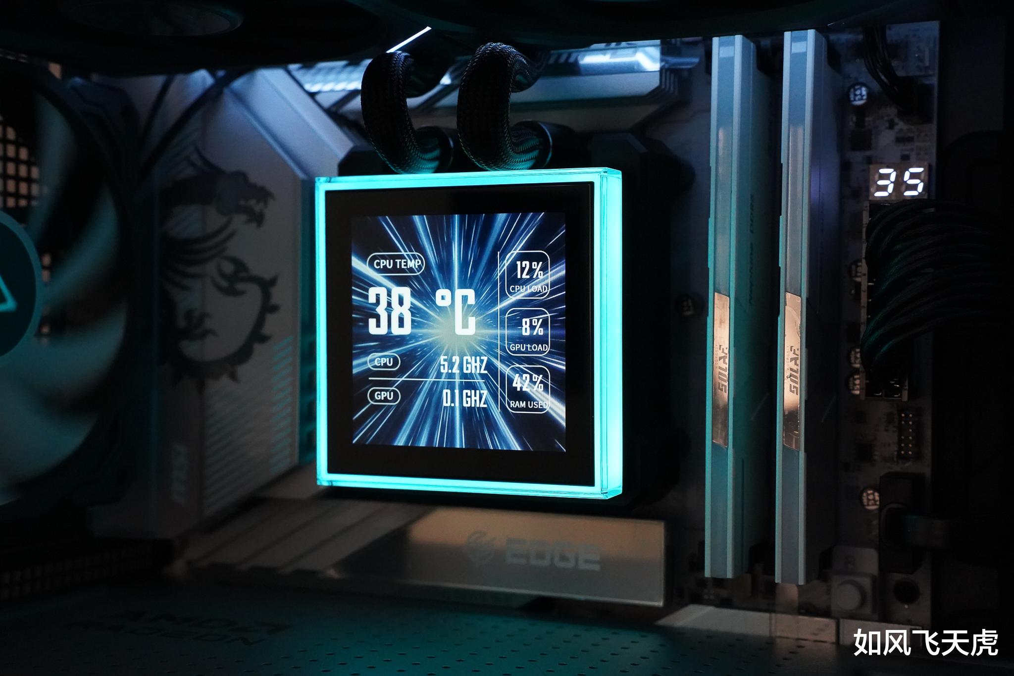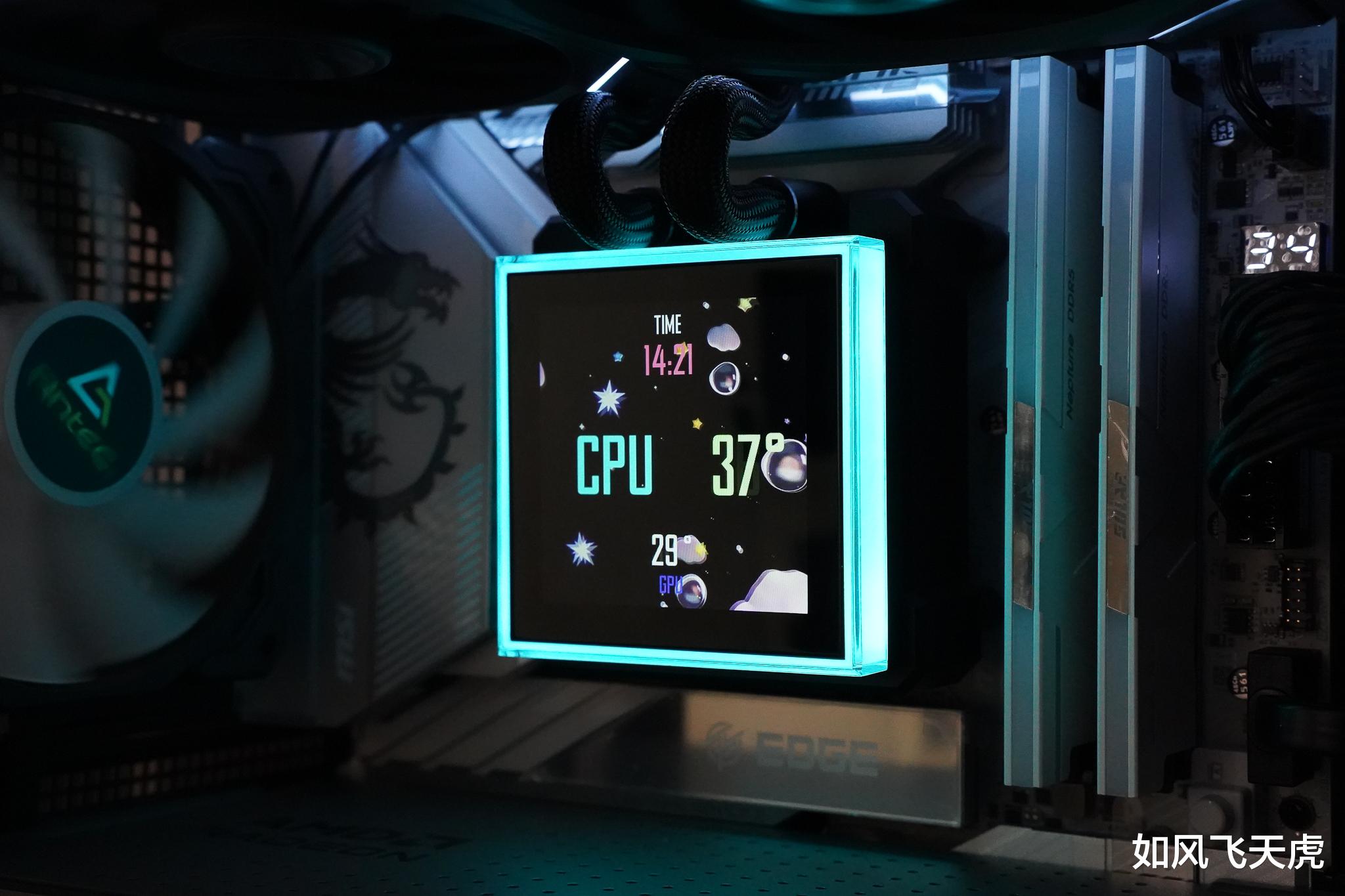 按下机箱的电源键,机箱内泛出了七彩的光。这块大大的水冷显示屏,立即就显示水的温度和水泵转速,令人惊讶。原来这款水冷头具有3种模式,最简单的无需连接USB和L-Wireless Controller,就可以在预设的主题来监控水温和水泵转速,不占用系统资源。