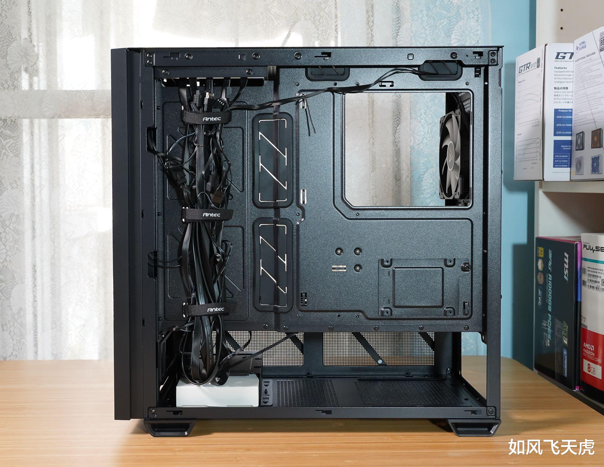 顶部可拆卸防尘网有效阻隔灰尘,底部横贯式防尘设计进一步提升清洁度,配备2颗螺丝位,为硬盘支架预留空间。侧透玻璃采用卡扣式设计,无需工具即可轻松拆卸,装机与维护更便捷。机箱支持ATX、M-ATX、ITX主板,预装5把风扇(前2×140mm、背1×120mm、电源仓顶2×120mm),开箱即享高效风道。内部走线区集中清晰,预留M.2 SSD位,左侧可拆卸硬盘支架支持双3.5英寸或2.5英寸硬盘,扩展灵活,为高端平台提供稳定、整洁、高效的安装环境。478 x 222 x 465mm的尺寸,在支持ATX主板的机箱中属于较精致的大小。
