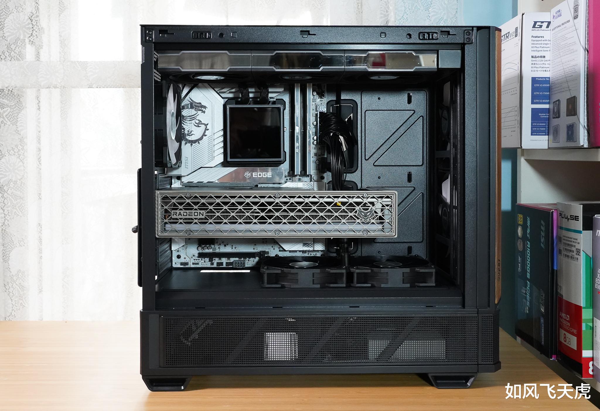 安装完毕,整机外观方正挺拔,线条利落,方正主题贯穿从主板、内存到机箱的全平台设计,风格统一,颜值在线。得益于无冷管在机箱内乱穿,内部布局井然有序,线材走线整洁,供电接口隐藏得当,整体视觉舒适度拉满。不仅性能强劲,更像一件精心打造的桌面艺术品,高端大气,观感舒适。