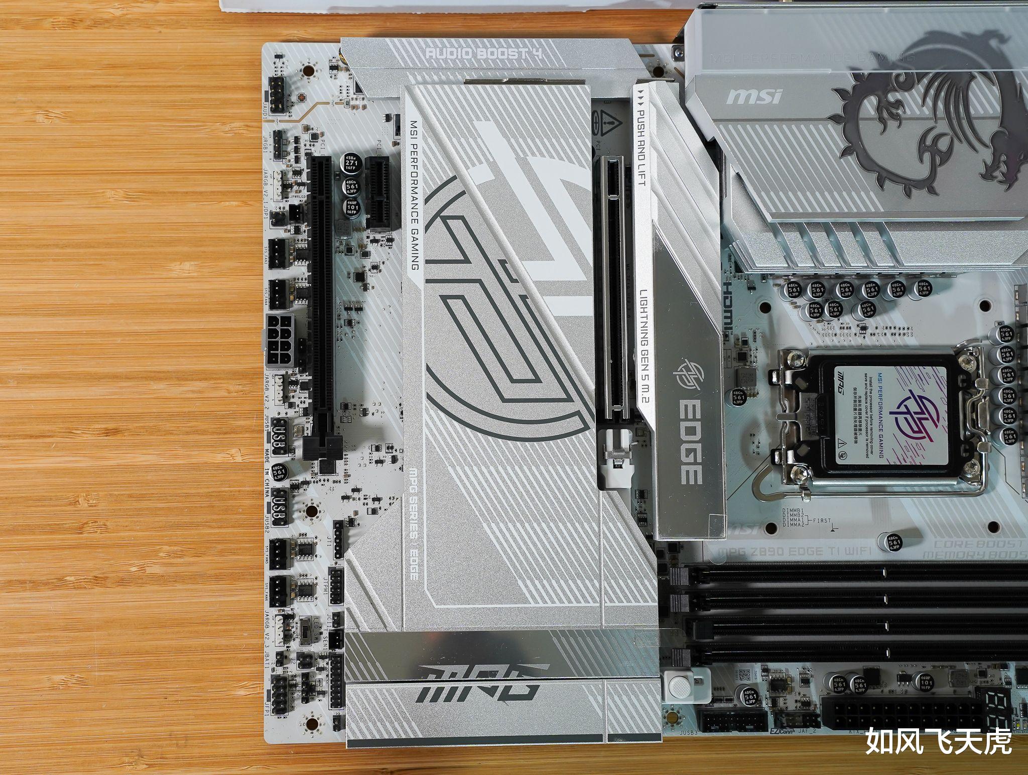 这次搭配的主板是微星 MPG Z890 EDGE TI WIFI 刀锋钛,一款通体纯白的旗舰级主板,颜值直接封神。银白金属散热装甲覆盖核心供电区域,不仅视觉冲击力十足,更有效导热散热,兼顾美学与实用性,堪称“颜值即正义”的典范。