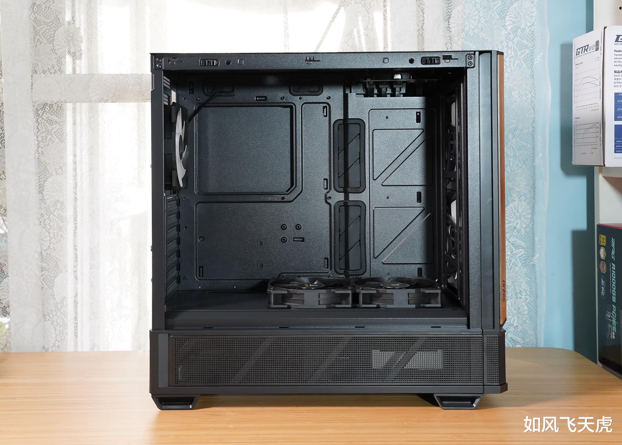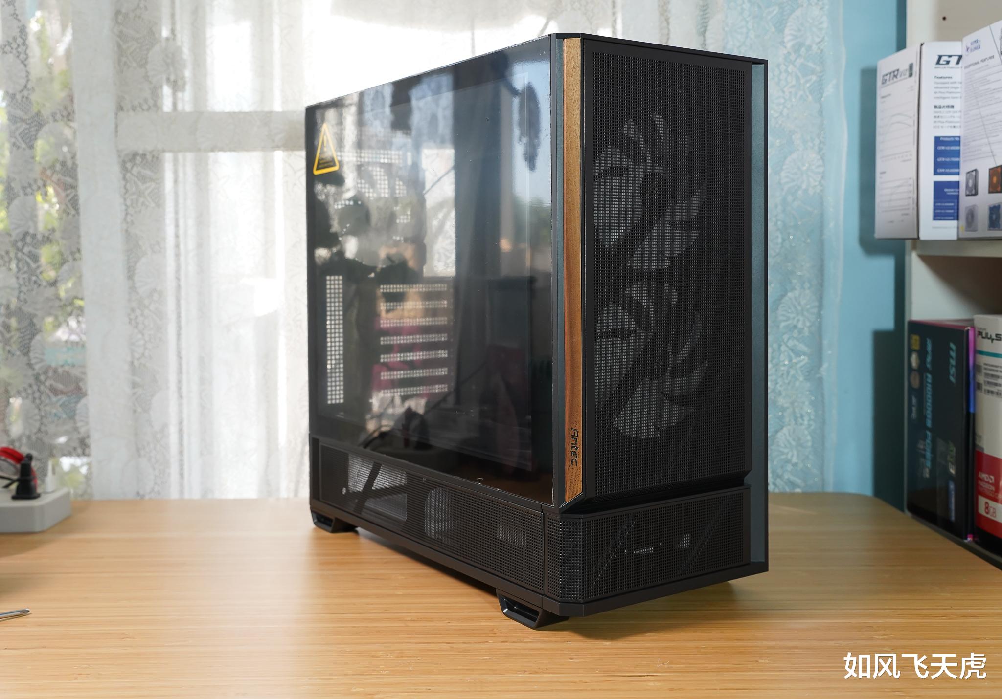 机箱选择安钛克新品机箱P30,它方正稳重,线条简洁利落,前脸采用金属网面设计,通风高效,冷风顺畅进入,隐约可见前部预装的两颗140mm ARGB风扇,彰显强大散热潜力。左侧搭配高级木纹装饰板,质感温润典雅,融合现代科技与经典美学,视觉层次丰富,百搭各类桌面风格。
