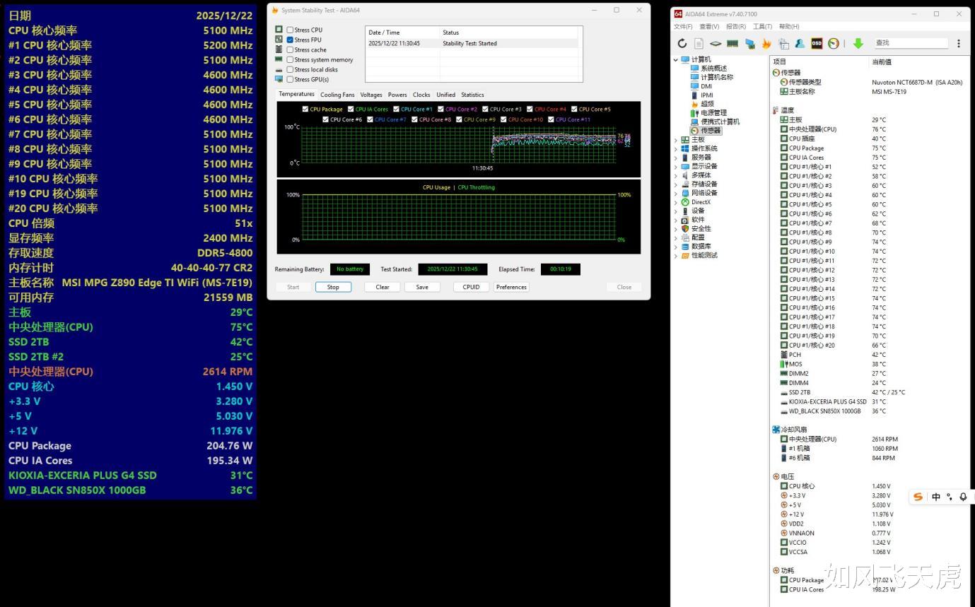 运行AIDA64 FPU 压力测试,10分钟后,结果显示CPU功耗在205W,CPU温度在76°C,可以说效果很不错。