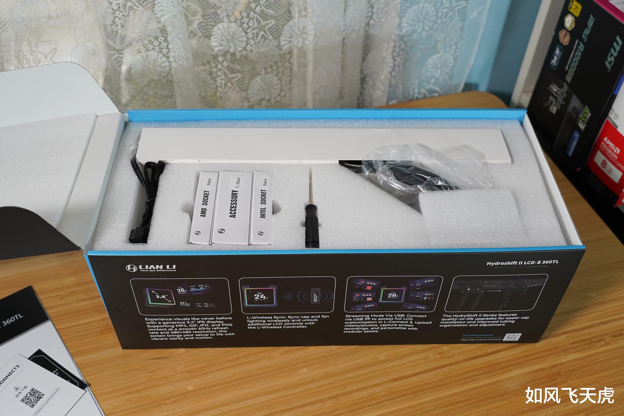打开盒子,里面白色泡沫包裹,排列整齐。冷排有白色纸壳保护,冷头上面也有软泡沫,一把定制螺丝刀,三个配件盒整齐排列。可以说每一处都经过精心设计,排列整齐、层次分明,完全没有“乱塞”的感觉,光是开箱这一瞬间,就让人感受到品牌对用户体验的极致重视。