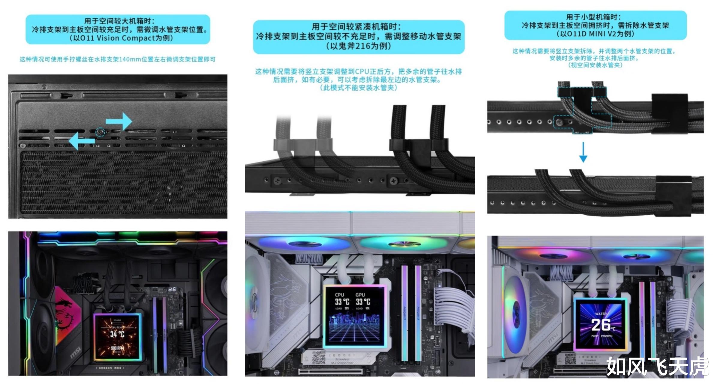 前面说过,冷排侧面有2个冷排支架和1个竖立支架。那么不同的机箱大小不同,从冷排到CPU的距离也不同。这款水冷有相应的设计,可以应对各种不同间距的情况。如果是较大的机箱,那么这个距离较长,可以直接安装或者简单微调下即可。而如果是中等距离,调整移动下水管支架的位置。