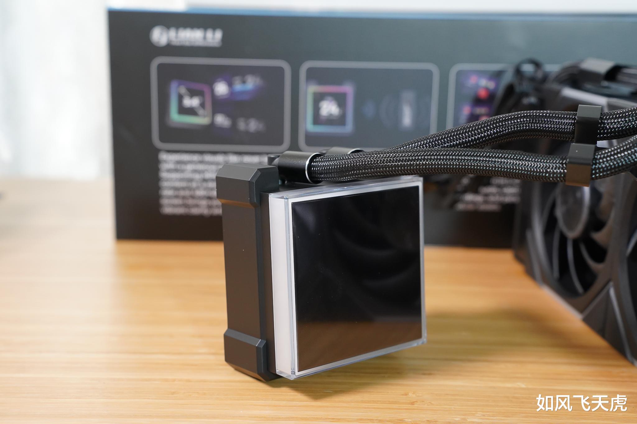 水冷头,带有方形的显示屏。可以看到冷头外面似乎并没有线引出,这是因为冷头的USB供电与传输线材都集成到了冷水管中,从而看上去更加简洁。显示屏是3.4英寸 IPS大屏幕,高达480x480分辨率,500尼特亮度,60Hz刷新率。