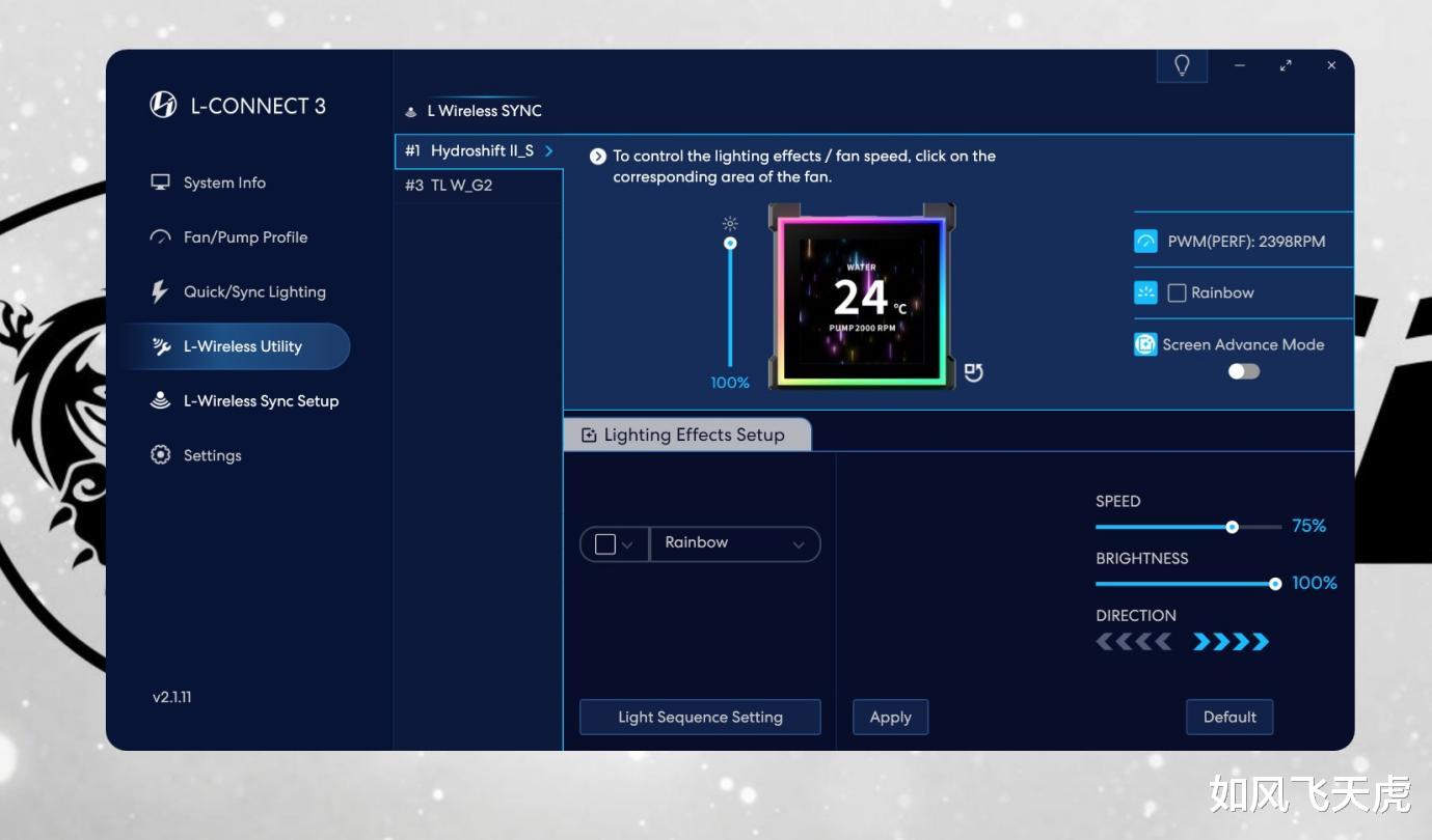 这款水冷有专用的控制软件,安装软件后,使用L - Wireless Controller,可以使用不同的灯效和主题。