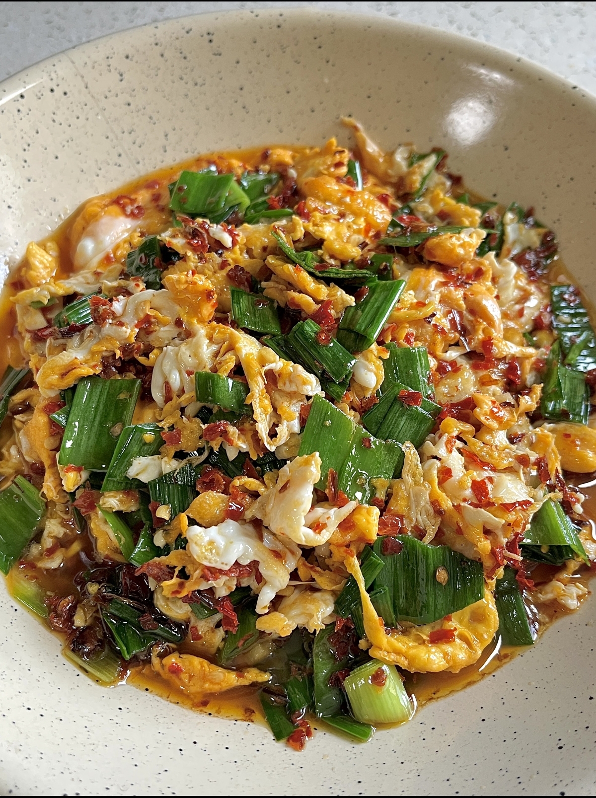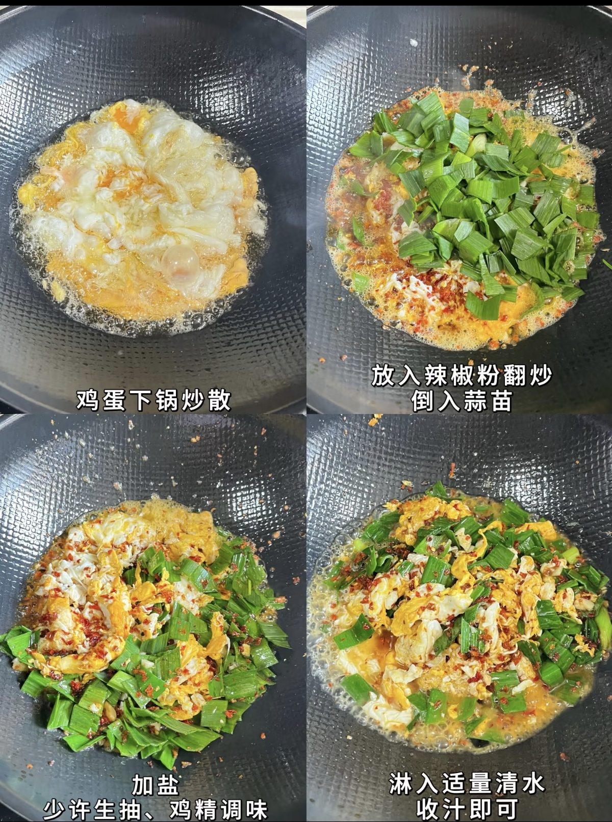 将打好的蛋液缓缓倒入锅中,随着“滋啦”一声响,蛋液迅速膨胀凝固。用锅铲快速划散,将鸡蛋炒至刚刚熟透但依然保持嫩滑的状态,然后盛出备用。这一步切忌炒得过老,嫩是这道菜口感的基础。锅中留底油,如果油不够可以再加一点,烧热后,先放入切好的蒜白部分,快速翻炒出香味。紧接着,撒入一大勺辣椒粉,瞬间,浓郁的辣香混合着蒜香弥漫整个厨房,让人食指大动。快速翻炒几下,让辣椒粉的香气充分释放,并与蒜白的汁水融合。