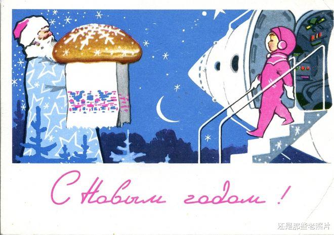 1966年的苏联新年贺卡上,宇航员正走下飞船——这是加加林进入太空的五周年。