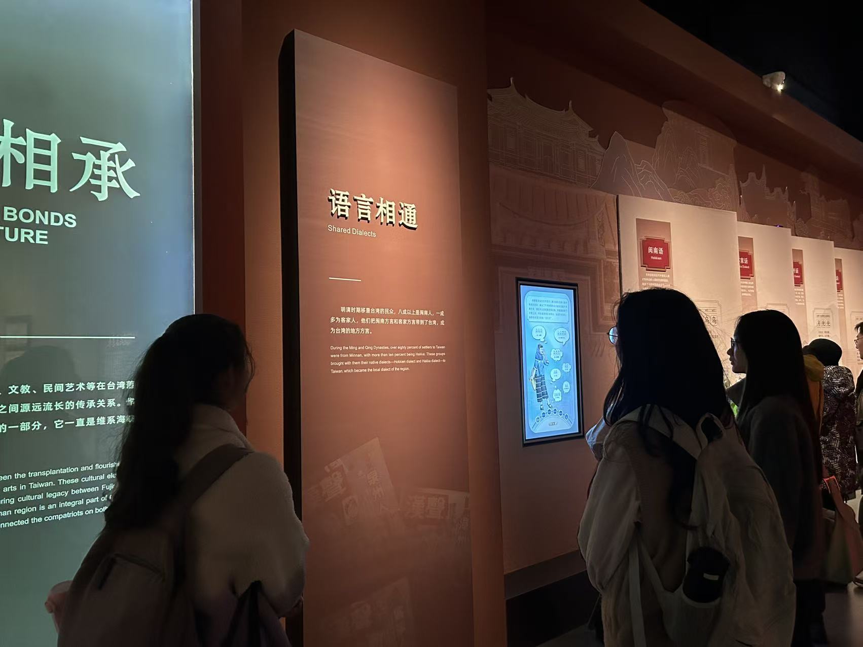 1月27日下午,实践队走进中国闽台缘博物馆,以“同文同种、同根同源”为主线,通过展板了解到明清时期赴台垦殖的民众中,八成以上为闽南人,他们将闽南方言带至台湾,使其成为当地通行的地方方言。在语言互动展区,队员们还亲身体验了方言的奇妙,通过答题小游戏学习闽南语日常词汇的读音与释义。实践队成员在其中慢品闽台的千年羁绊,切身领悟到两岸之间的同源文化与同脉亲情,在新与旧的对话里,邂逅最深情的“两岸一家亲”。
