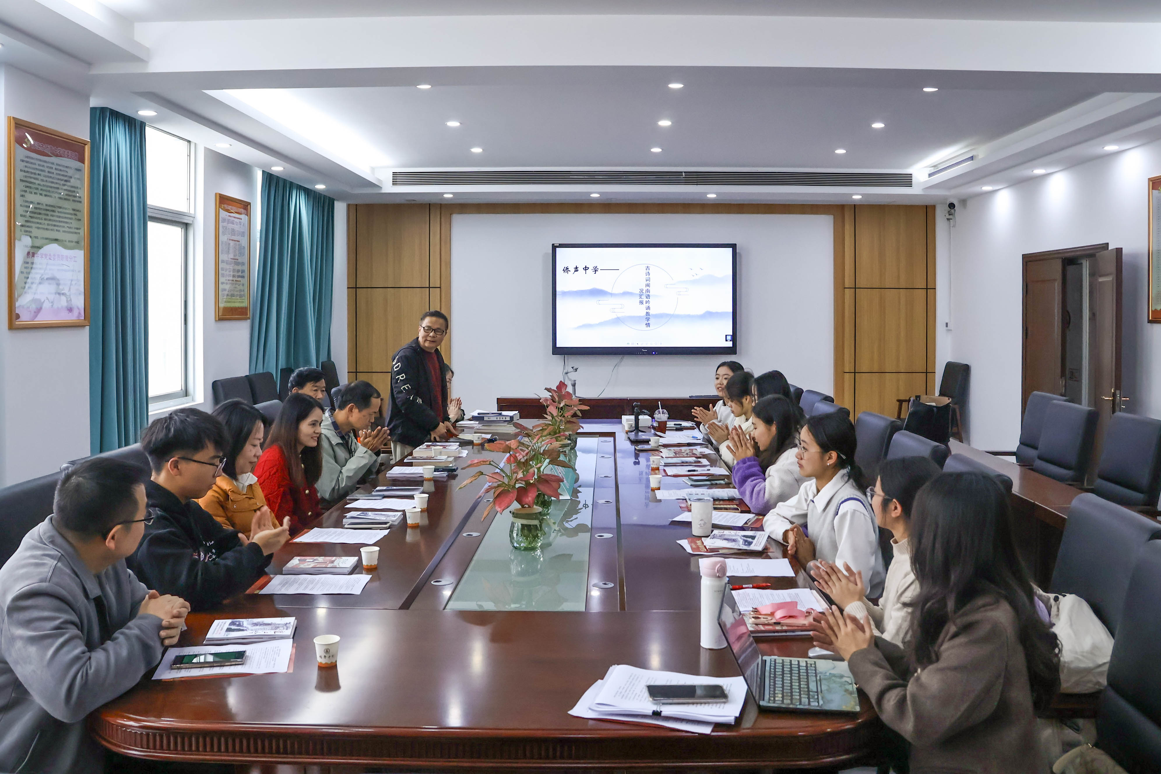 次日,实践队转赴泉州市晋江市侨声中学,与多位专家、一线教师齐聚一堂,共同举办了古诗词闽南语吟诵交流研讨会,探讨闽南语吟诵的传承与创新路径。研讨中,双方分享了侨声中学百草园诗联社在校园推广闽南语吟诵的成功经验,更直面教学中的痛点难点,对闽南语音韵特点、吟诵调式保护等问题进行了专业解答。蔡子芳、戴连续、施永瑜等老师从音韵学角度出发,主张在吟诵教学中侧重“文读音”,以还原古诗词的音韵之美与文化厚度。针对学生难掌握的国际音标问题,施永瑜老师还现场展示了用简易符号替代复杂音标的教学创新。这场跨校际的对话,不仅为实践队破解了理论与实践结合的难题,也凝聚了以简驭繁、守正创新的传承共识,为古诗词闽南语吟诵的活态传承注入了新动能。