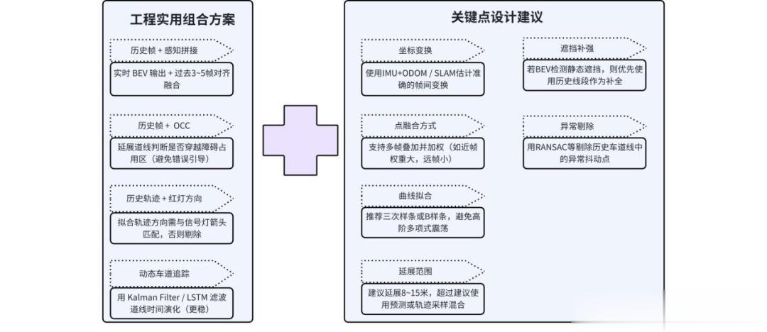 感知受遮挡、光照、路口车道线消失等影响,BEV或前视模型输出不连续。地图存在精度问题,或某些城市道路未覆盖精细拓扑。此时,通过使用历史时刻的感知车道线或轨迹点,作为当前车道线拟合的参考,引导轨迹构建、车道选择、通行区域判断。