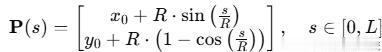如上解法概述为可以构造圆弧 or 曲率变率可控的样条段,这里可以用圆弧(常曲率)进行脑补。若已知或感知出前方车道有一个近似固定的转弯半径 R,可以延展出一段圆弧(constant curvature arc), 延展圆弧的轨迹表达式为: