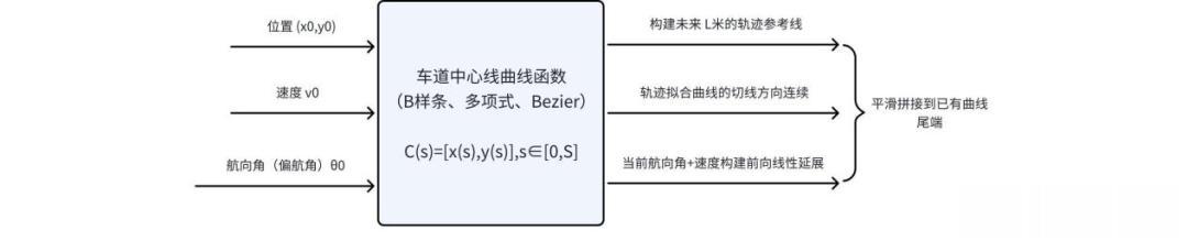 轨迹延展策略(Future Projection)可以使用当前车速/航向角加上拟合曲线的延展方向,构建前方10~20米的车道参考中心线,用于轨迹规划器(或轨迹采样器)约束自车路径生成。