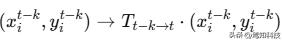如下图表示整个从历史点延展到当前点变换拟合的整个过程,即Transform的计算过程。两个 T 阵可以看成是在对当时的相机外参矩阵进行标定。每一帧(历史帧 t−k、当前帧 t)都有自己的相机外参(或者说自车坐标系到世界坐标系的变换矩阵)。所以 Tt−k 就是那一刻的车体在世界坐标系下的位置和朝向,等价于 camera-to-world 外参。