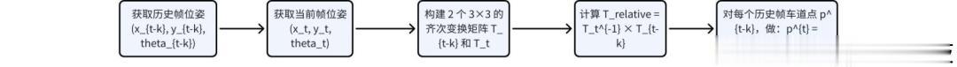 其中,θ:车辆在 t 与 t-k 帧之间的偏航角变化;Δx,Δy:车辆 t-k 到 t 帧的平移量(可以是轮速里程计、IMU积分或GNSS测得);输入点需以齐次形式: pt−k=[x,y,1]T。