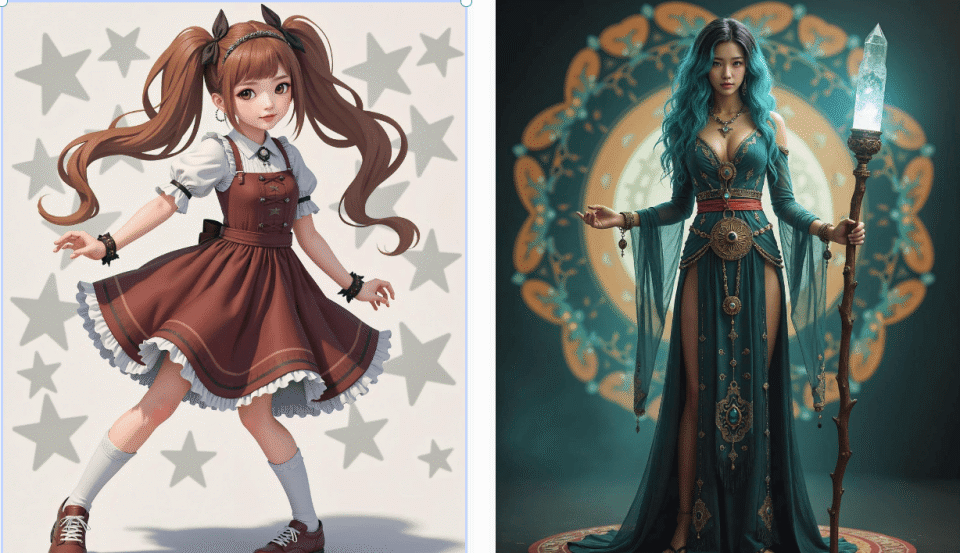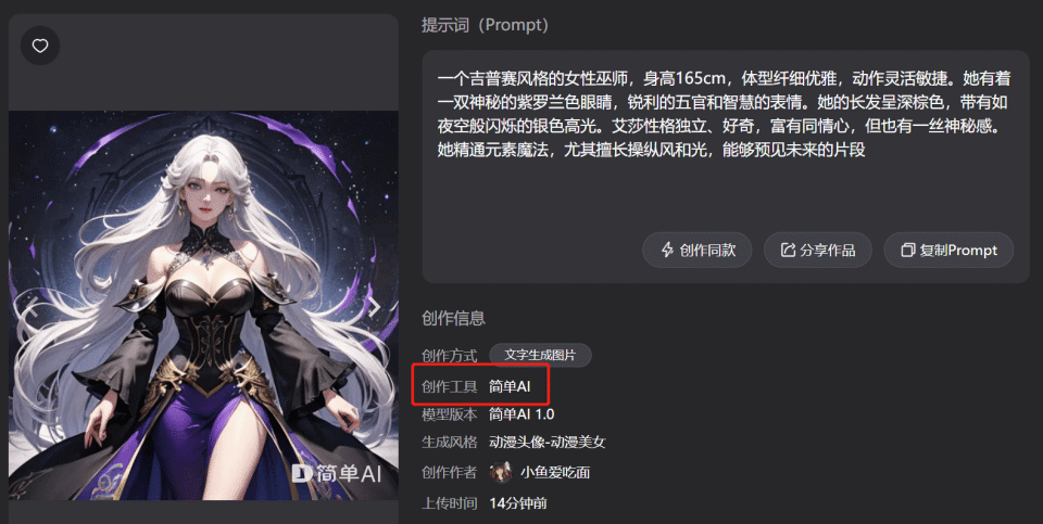 例如:"创造一个吉普赛风格的女性巫师角色,她生活在一个充满魔法的幻想世界。"