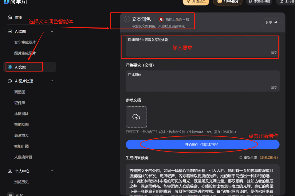 使用搜狐简单AI的【AI文案】—【文本润色】工具,扩展角色的具体特征。