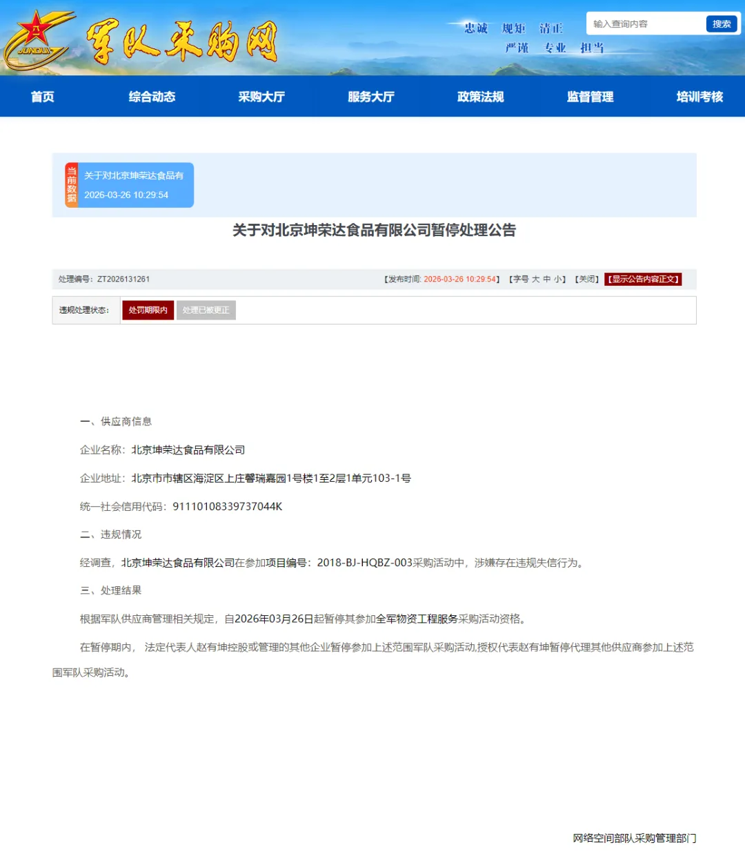 3月26日,军队采购网发布《关于对北京坤荣达食品有限公司暂停处理公告》(ZT2026131261)。