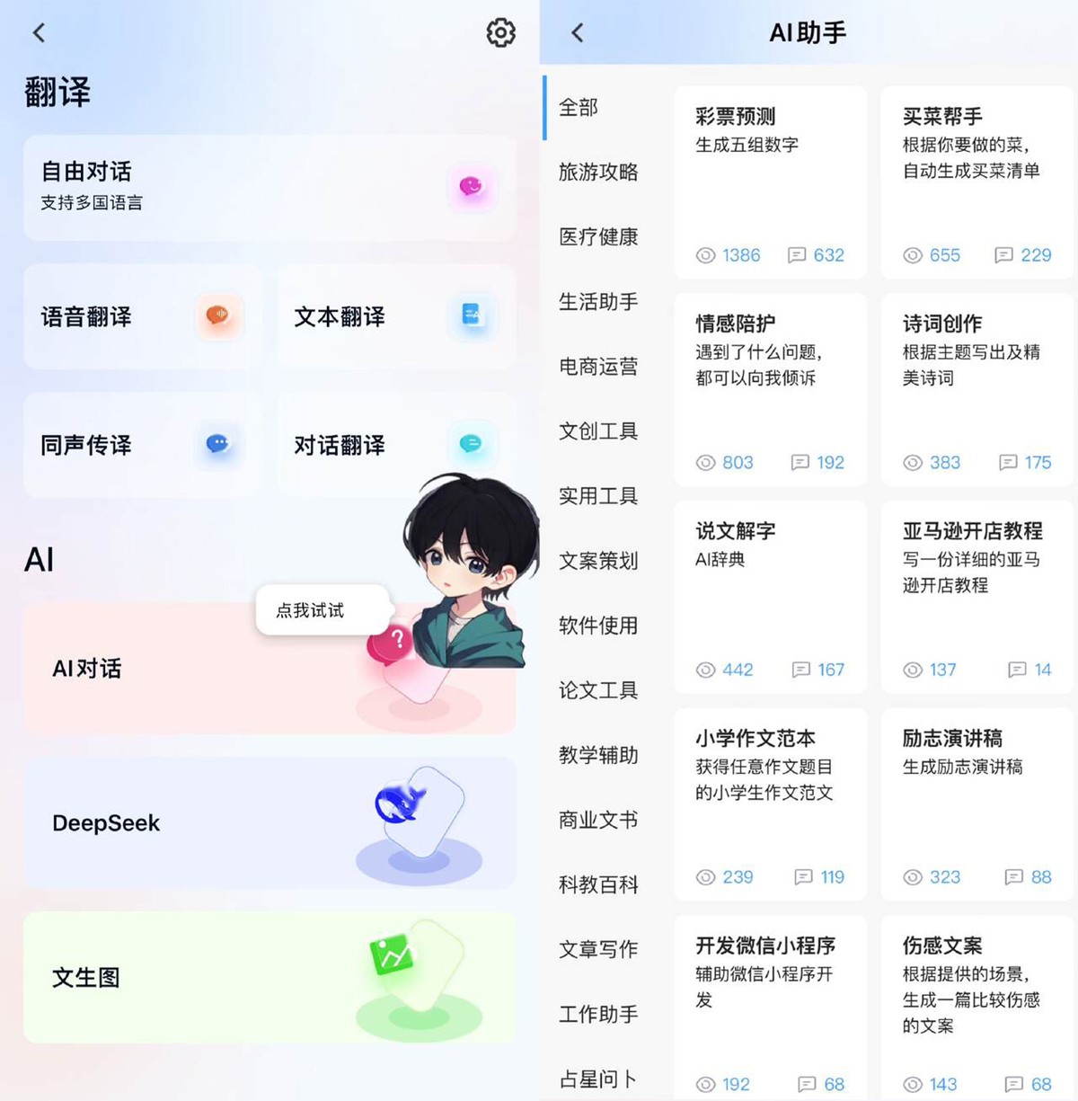 这个集成讯飞、DeepSeek等多模态AI智能的系统,汇聚了AI翻译、AI对话、AI语音助手、AI生成图像、AI深度搜索、AI情绪陪伴、AI实用工具等数十项AI能力。