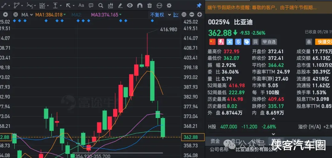 在魏建军说了汽车圈的恒大已经存在,只是没有暴雷的几天后,比亚迪股价连跌三天,4天前每股股价还416元/股,今天收盘只剩363元/股。