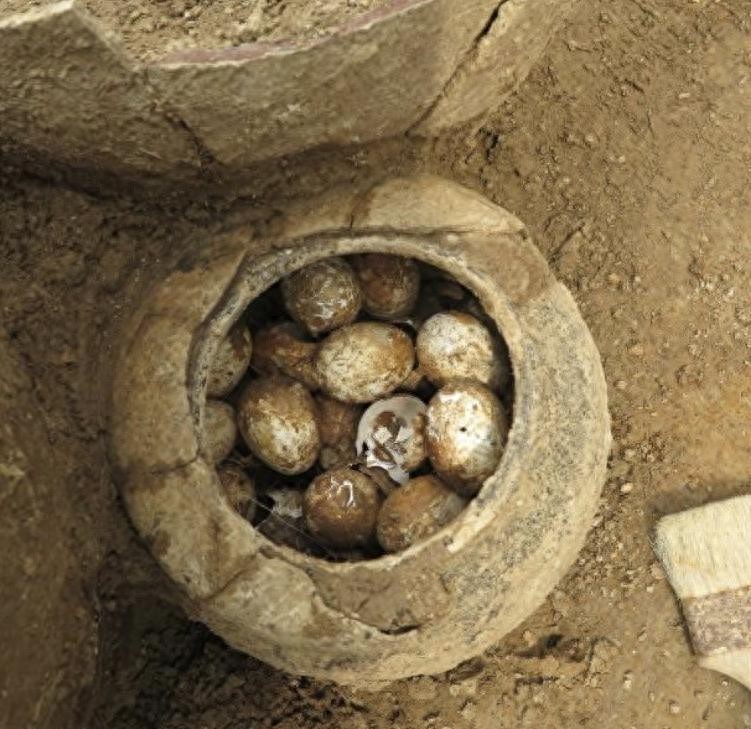 墓葬中会放各种随葬品,比如日常用的陶器、食具、粮食、酒器等,鸡蛋作为一种营养丰富的食物,也具有一定的象征意义,所以被放进陶罐中陪葬。