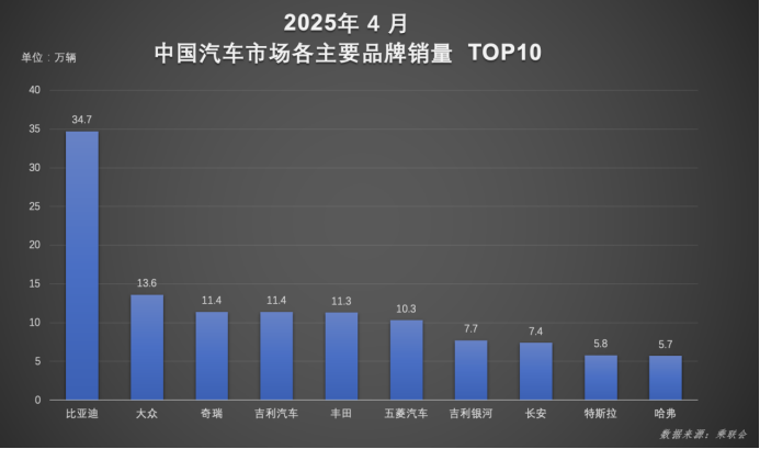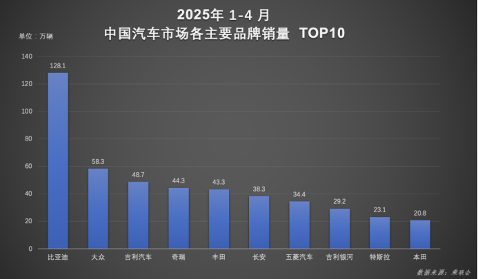4月,比亚迪汽车交出了一份令人瞩目的成绩单,单月销量高达34.7万辆,在竞争激烈的中国汽车市场中脱颖而出,稳坐各主要品牌销量TOP10的头把交椅,销量近乎第二至四名之和,尽显王者风范。1 - 4月累计销量突破128.1万辆,同比增长态势迅猛,持续领跑新能源汽车市场,彰显出强大的市场号召力与品牌影响力。