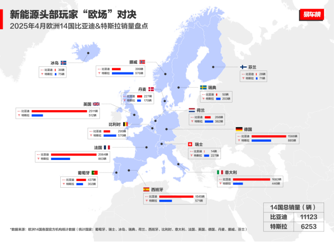 海外市场,比亚迪同样展现出强大的拓展能力。4月海外销量达79086辆,同比增长90.8%;1 - 4月累计出口超29.3万辆,同比增长110%,海外市场增长曲线持续上扬。在欧洲这一传统汽车强国的腹地,比亚迪更是实现了对特斯拉的全面超越。4月,在西班牙、意大利、法国、英国和德国等核心市场,比亚迪销量一路领先。从欧洲14国整体市场数据来看,比亚迪销量大幅领先特斯拉。截至2025年5月,比亚迪已成功挺进超过20个欧洲国家,全球化战略布局不断深化。