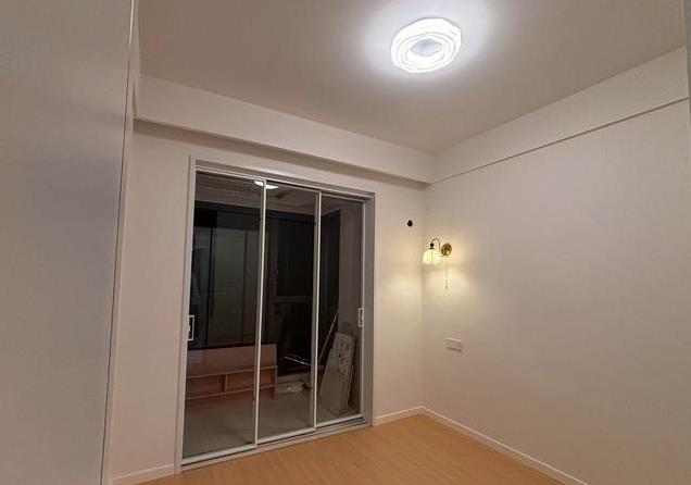 过道顶面安装了吊顶,安装了几个筒灯,照明亮度是足够的。并且,卧室门为白色的,非常干净,好看。而且可以看到,卫生间选择了半墙体的设计,比较流行的做法,这样做也是真正实现了卫生间的干湿分离。